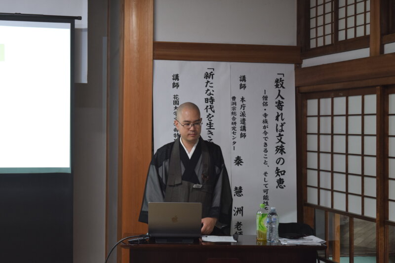 中食をはさみ、午後からは講義Ⅲとして、本庁派遣講師 秦 慧洲 老師より「数人寄れば文殊の知恵 ~僧侶・寺族が今できること、そして可能性を考える~」と題して行われ、それぞれグループに分かれての研修となりました。